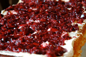 I went about putting it all together. I unrolled the angel food, spread it with the cherries, spread it with cream, and rolled that sucker back together. Here again I made the error of not trusting my judgement. Still trying to salvage the presentation, I duly rolled the darkest side inside. When I photographed this, like a diva with a big hairy mole, I tried to find its "best side." I cut the edge even and photographed the part that showed the most fruit and cream.