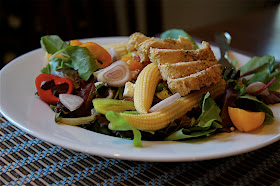 After making Montreal Chicken, I had one chicken breast left over. The next day at lunchtime that delightfully tangy and seasoned chicken breast was calling to me. When I opened the fridge to get the chicken breast I scanned for other elements that would add flavor, texture, and color to the salad. The final result: