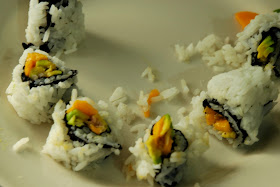 If you try this recipe: I recommend becoming comfortable with rolling rice inside before you attempt the more advanced artistry of rolling the rice outside. If you are a beginner, I recommend putting all the goodies inside to start, and then work your way to the advanced moves as you become more comfortable. I think the shrimp would be perfect in this roll, but if you are vegetarian I thought the omission was also perfectly delightful.