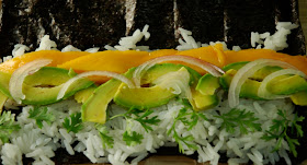 My failure to secure shrimp also forced me to alter Sushi Day’s presentation in another way. Sushi Day presents the roll with the shrimp and onion on the inside, the rice on the outside, and the avocado and mango thinly sliced and alternating like gorgeous colorful “scales” on the outside. It is really a stunning presentation. But without the shrimp it seemed sort of sad and strange to roll it with only onion on the inside. So I put the onion, cilantro, mango and avocado all inside and tried rolling one with the rice on the outside.